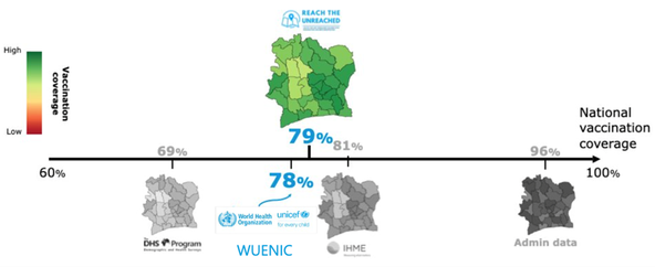 There is no single data source that can tell the truth. For example, UNICEF data confirms that in Côte d’Ivoire, the new modelled estimates (79 percent) align closely with WHO-UNICEF coverage statistics (78 percent). However, other datasets – particularly administrative records – have been found to significantly overestimate vaccination rates, underscoring the importance of using triangulated data sources.