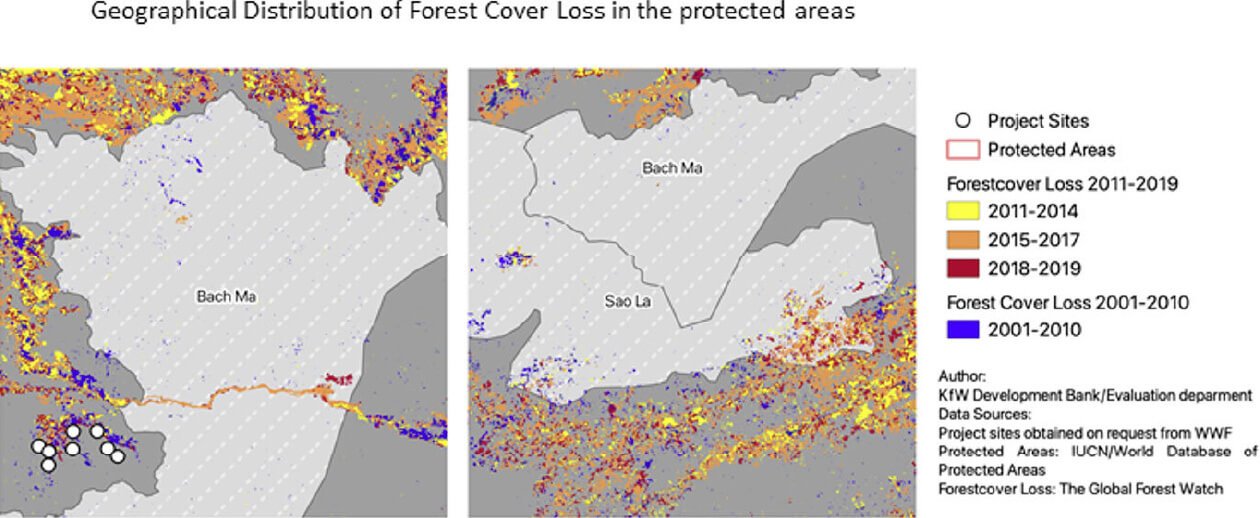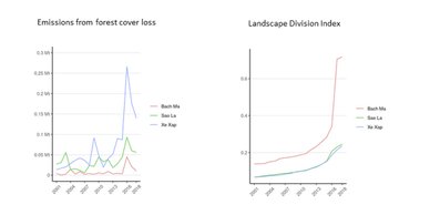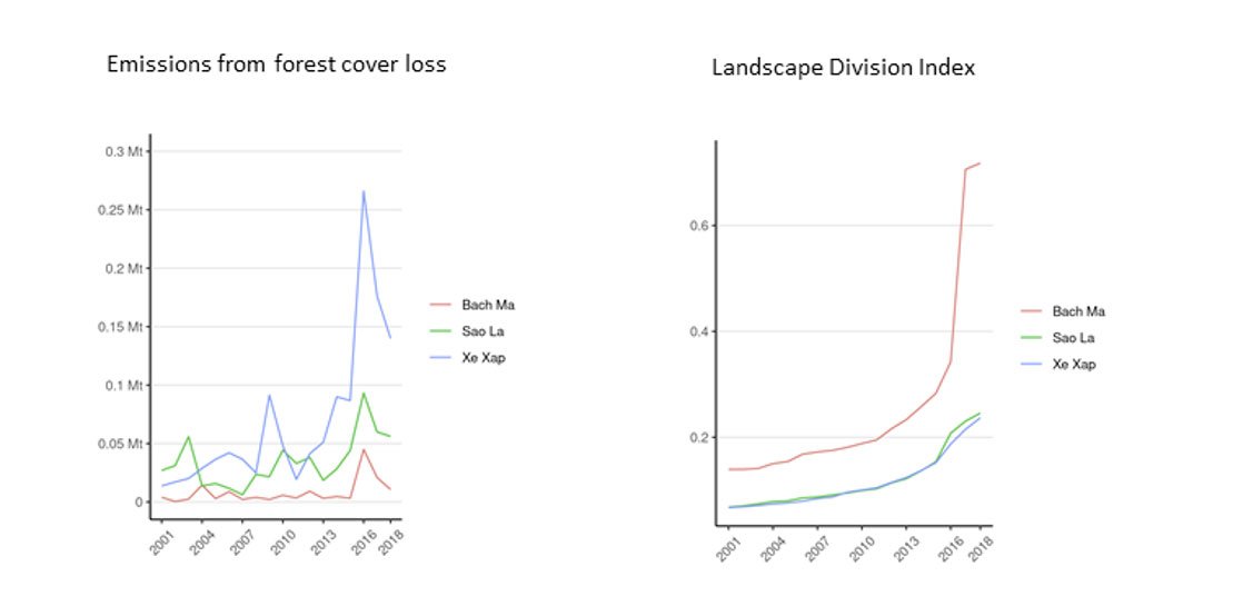 In this evaluation, we analyzed forest cover loss and associated CO2 emissions, as well as habitat fragmentation in three protected areas: Bach Ma National Park, the Sao La Nature Reserve (both in Vietnam), and Xe Sap National Park in Laos. The maps demonstrate the distinctive pattern of forest cover loss in Bach Ma National Park, most of which occurred in 2016.